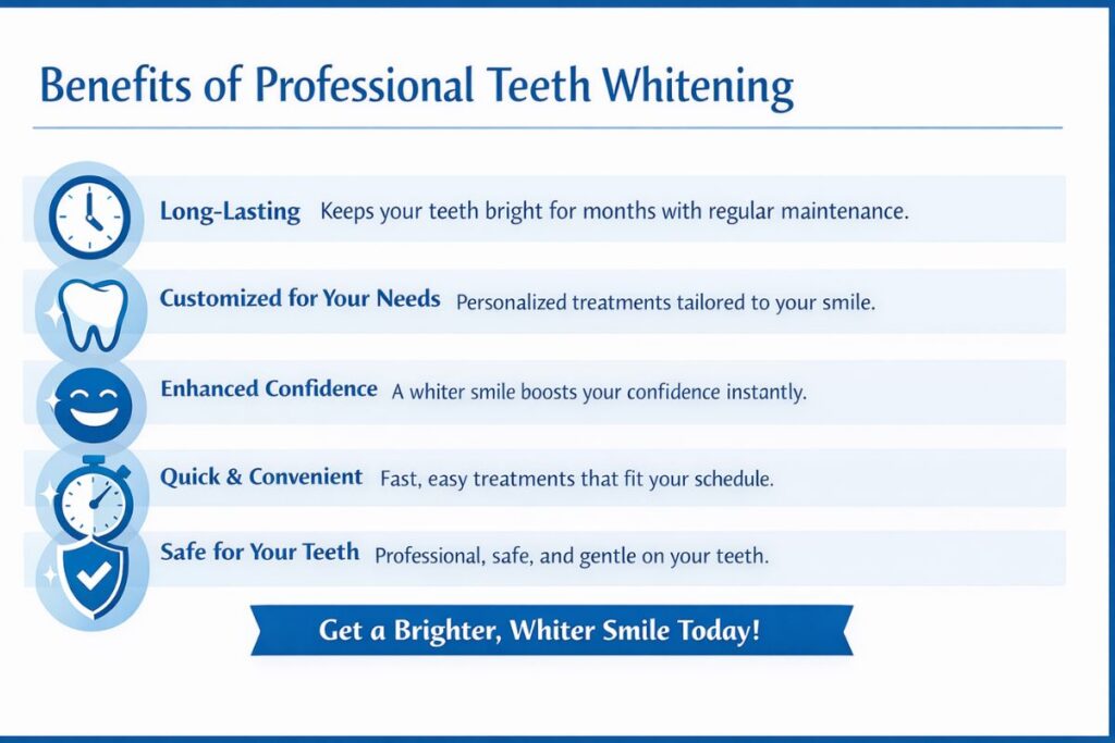 Professional teeth whitening uses powerful gels that break down stains and discoloration on your teeth. The whitening agents penetrate deep into the enamel to lift even tough stains, leaving your teeth brighter and more youthful.